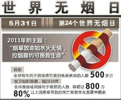 今天是世界无烟日,今年的主题是:烟草致命如水火无情 控烟履约可挽救生命。珍惜我们的生命,每天少抽一只烟,让我们的生命变得长一点,再长一点,珍惜我们的生命,少一些烟雾弥漫,多一些清新自然。