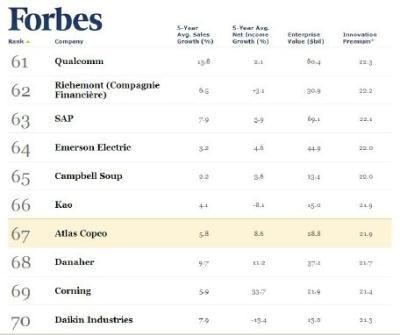阿特拉斯•科普柯在榜单中名列第69位,并与苹果、谷歌和亚马逊等公司一并入选。由于投资人预期公司未来的创新必将带来良好的收益,使得这些公司被投资人定义为溢价股并受到其追捧。“阿特拉斯•科普柯通过此种方式获得认可,我们感到非常自豪。这使得我们的品牌和公司对创新的重视为世人所皆知。”阿特拉斯•科普柯集团公共传播高级副总裁Annika Berglund说道。