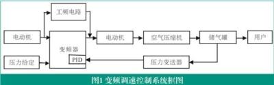 电动机拖动空气压缩机旋转,使之产生压缩空气,并存储于储气罐中口储气罐中空气压力的大小取决于空气压缩机产生压缩空气的能力心即电动机的转速)和用户用气量之间的平衡状况,为了保证供气质量,要求储气罐空气压力稳定在某一数值上。储气罐内的压力为被控量,压力变送器将储气罐的压力变换成电信号送给变频器PID单元,与压力给定值进行比较,SID功能单元根据比较所得偏差的大小和方向按预定的PID运算规律运算后产生控制信号改变变频器的愉出,从而改变电动机的转速,使储气罐内的实际压力始终维持在给定值上口同时,设置工频电源电路,使空气压缩机在变频器出现故障时不致长时间停机,并利用变频器工.频运行切换控制功能,进一步提高电机的运行效率。